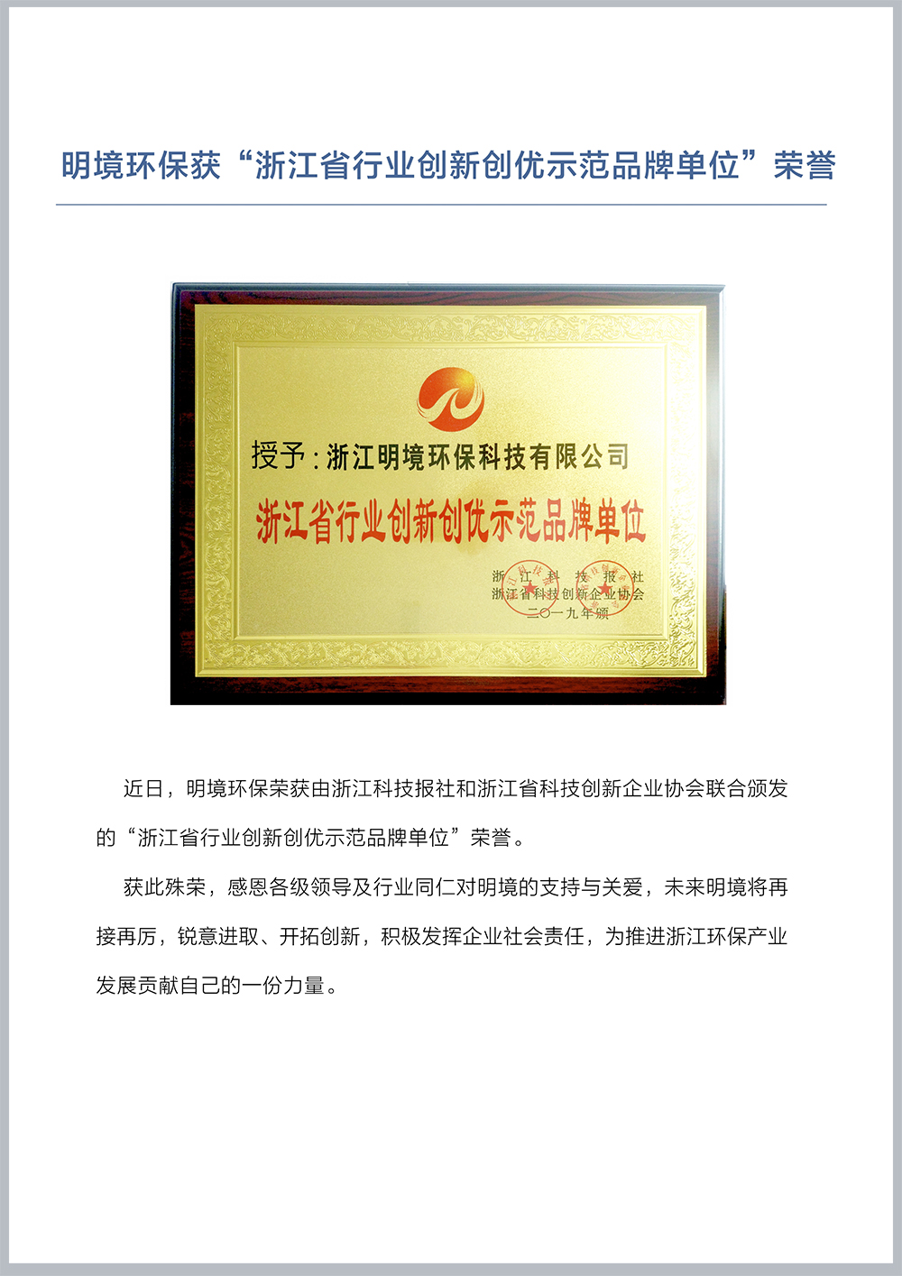 明境環保獲“浙江省行業創新創優示范品牌單位”榮譽